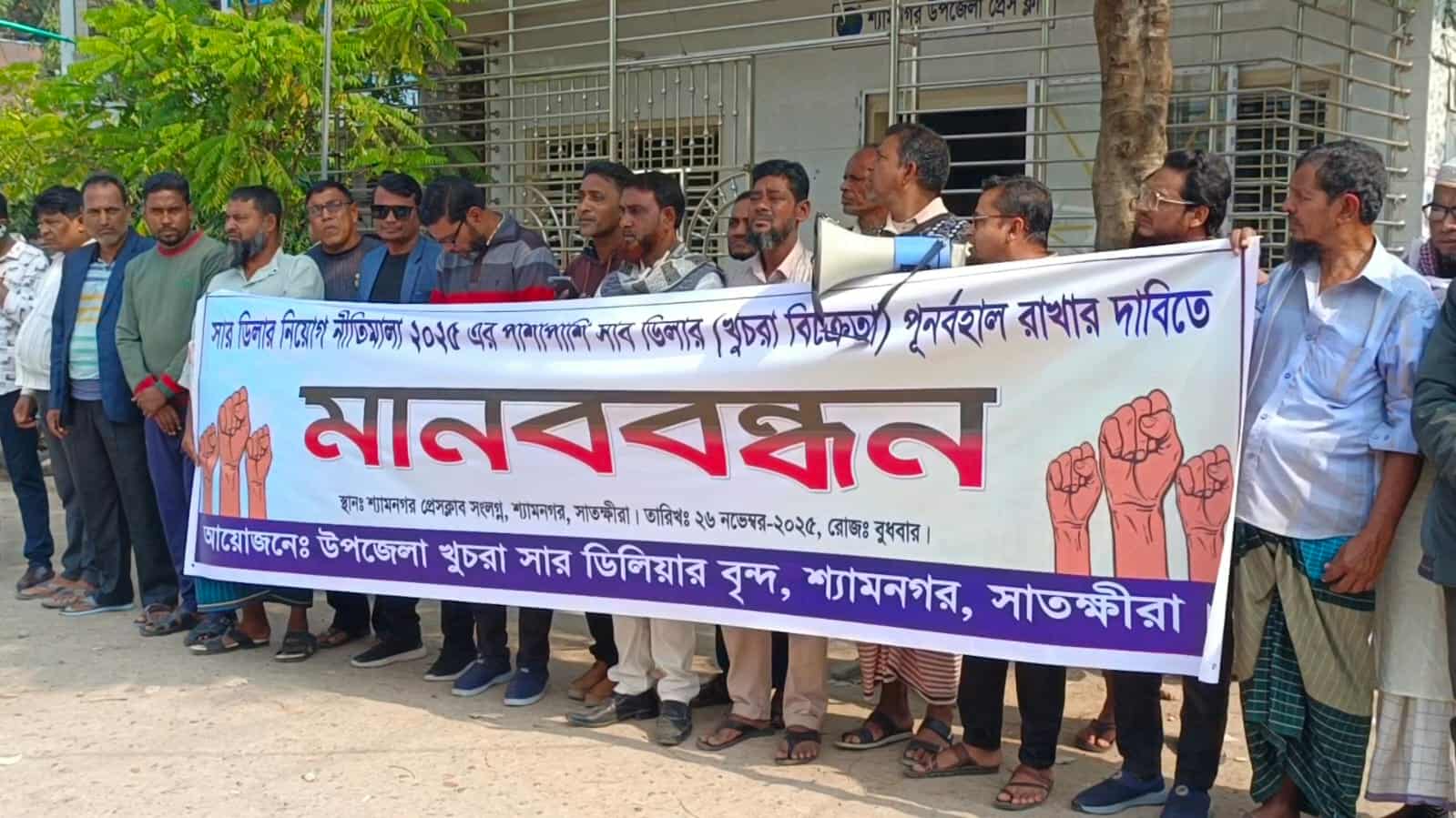 শ্যামনগরে নতুন সার নীতিমালা বাতিলের দাবিতে খুচরা সার ডিলারদের মানববন্ধন ও স্মারকলিপি প্রদান