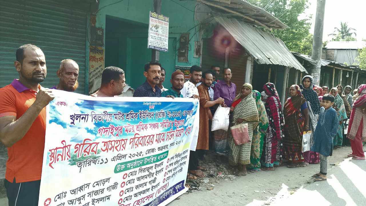 পাইকগাছার গদাইপুর মটর শ্রমিকদের উদ্যোগে দরিদ্রদের মাঝে চাউল বিতরণ